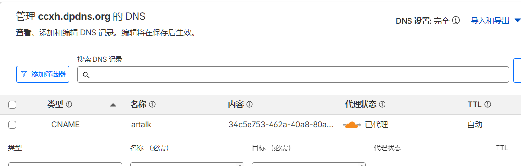 在cloudflare选择一个域名,添加GNAME记录,指向刚刚创建的隧道id.cfargotunnel.com